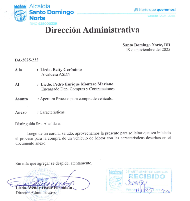 Tal como se escucha, desde la Dirección Administrativa se envió una solicitud a la alcaldesa Betty Gerónimo y al encargado de compras y contrataciones del Ayuntamiento, con el objetivo de comprar un «vehículo de motor».