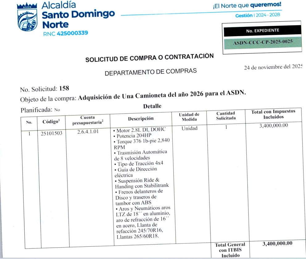 Santo Domingo Norte, RD. – Todavía sigue en el aire las razones específicas de la cancelación del carnaval municipal, si fue por falta de tiempo o recursos económicos, pero, para lo que sí tuvo dinero la Alcaldía de Santo Domingo Norte (ASDN), fue para gastar RD$ 3.7 millones de pesos en una camioneta del año.