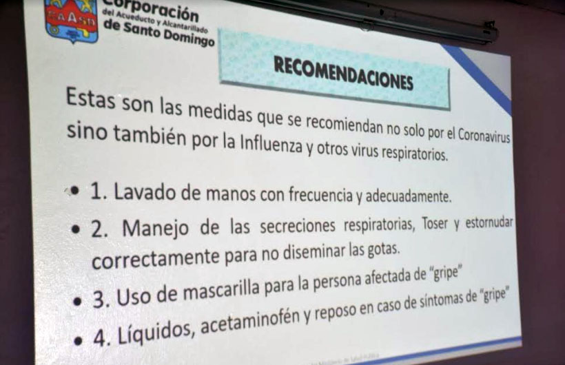 Santo Domingo. – La Corporación del Acueducto y Alcantarillado de santo Domingo (CAASD) orientó a sus empleados, junto al Ministerio de Salud Pública, sobre las medidas que se deben tomar para evitar un eventual contagio con el coronavirus (COVID-19).