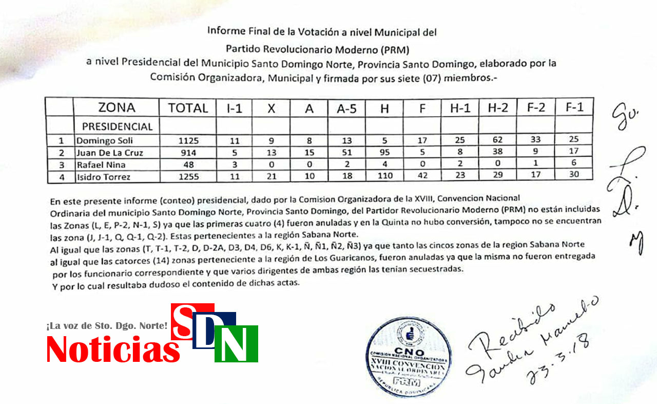 Santo Domingo Norte.-Según los datos que han sido suministrado a este medio Noticias SDN, compartiremos con nuestros lectores los nombres y cantidad de votos obtenidos por los miembros del PRM en SDN en la XVIII Convención Ordinaria del Municipio Santo Domingo Norte.