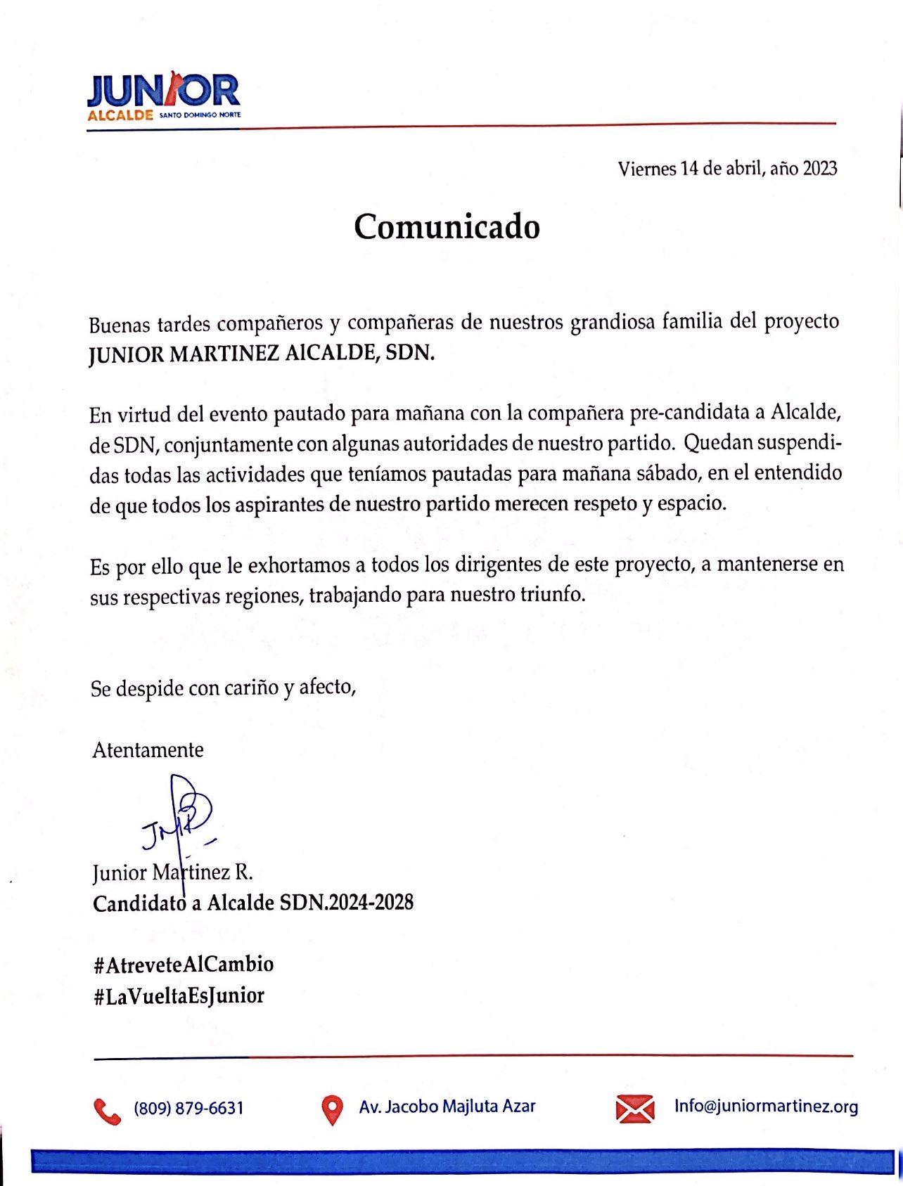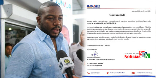 Santo Domingo Norte. – El aspirante a la alcaldía de este municipio por el Partido Revolucionario Moderno (PRM), Junior Martínez, ha emitido un comunicado con el que deja suspendida todas sus actividades políticas para este sábado, para respetar el espacio de su compañera de partido y aspirante al mismo cargo, Betty Gerónimo.