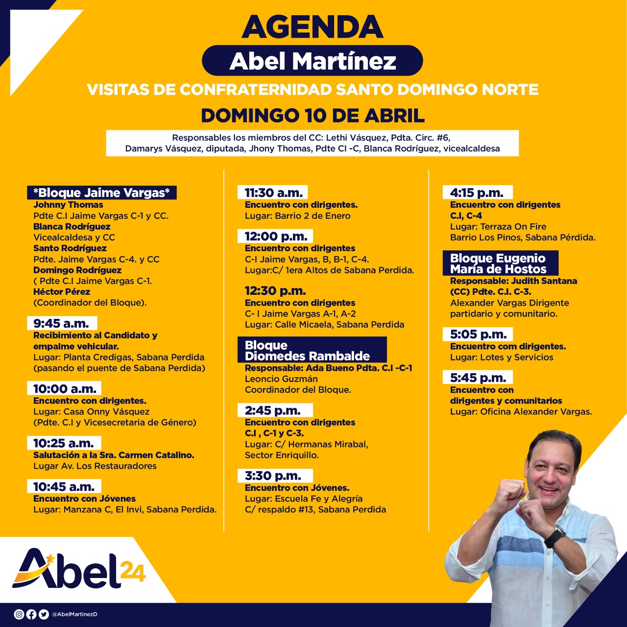 Desde el día de ayer, figuras políticas del PLD en Santo Domingo Norte, anunciaban que este domingo estaría haciendo un recorrido el precandidato presidencial Abel Martínez, bajo el nombre de «Visitas de Confraternidad».