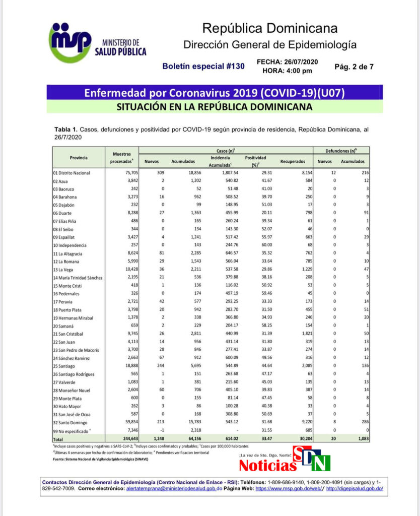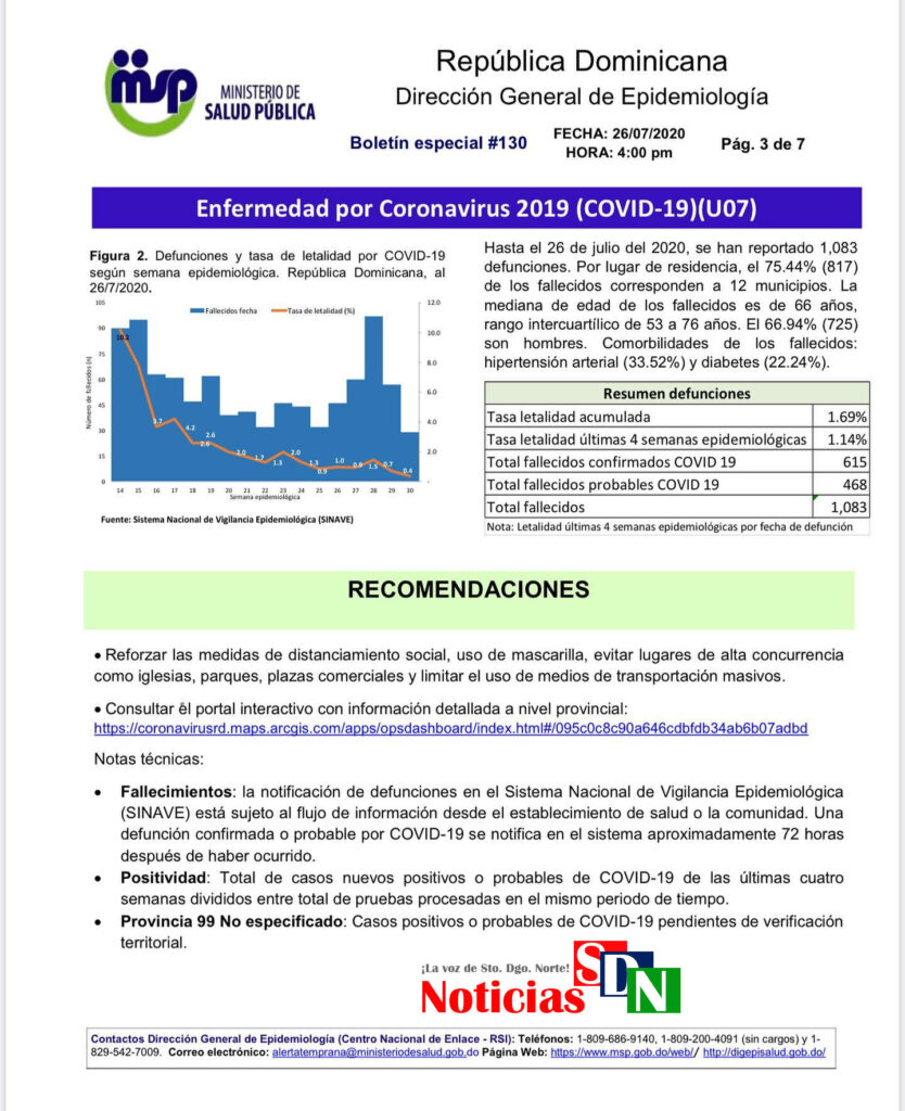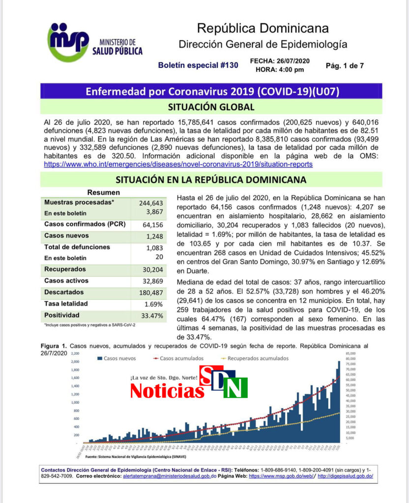 Ya suman 1, 083 las personas fallecidas por COVID-19 y un total de 64, 156 contagiados, según el informe más reciente del Ministerio de Salud Púlica (MSP), en su boletín no. 130.