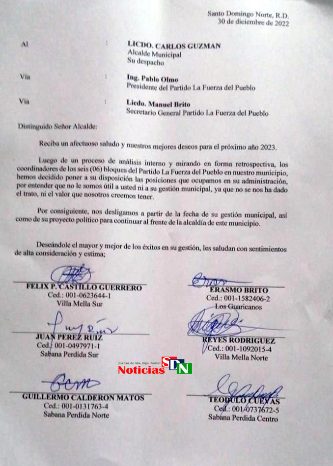 Santo Domingo Norte. – Seis coordinadores de la Fuerza del Pueblo (FP) en este municipio, han tomado la decisión de poner a disposición del alcalde Carlos Guzmán, los cargos que desempeñaban en el Ayuntamiento de Santo Domingo Norte (ASDN).