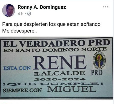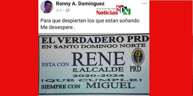 Santo Domingo Norte.- Gran revuelo a ocasionado en las redes la publicación de un dirigente del Partido Revolucionario Dominicano-PRD en SDN, tras este asegurar que «el verdadaro PRD está con René«, aludiendo el apoyo al actual alcalde como candidato al puesto que ocupa para las elecciones del 2020.