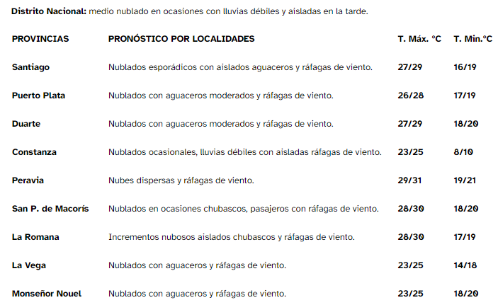 Distrito Nacional: nublados esporádicos con aguaceros dispersos y ráfagas de viento.