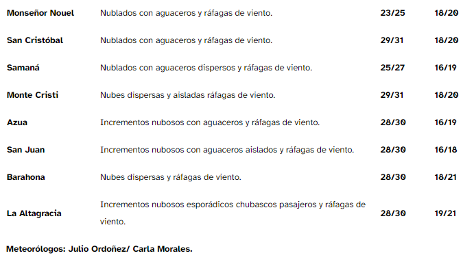 El viernes, se pronostica una atmósfera estable y con menor contenido de humedad estará favoreciendo un cielo mayormente soleado y de escasas lluvias sobre gran parte de la geografía nacional. No obstante, debido a los efectos del viento del este/noreste y la orografía, se prevén la ocurrencia de lluvias débiles y pasajeras con ráfagas de viento, principalmente en horas de la tarde sobre localidades de las regiones norte, noreste, sureste y la Cordillera Central.