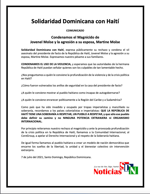 Santo Domingo. – Solidaridad Dominicana con Haití, expresa públicamente su rechazo y condena el vil asesinato del presidente de facto de la República de Haití, Jovenel Moïse y la agresión a su esposa, Martine Moïse. Expresamos nuestro pésame a sus familiares.