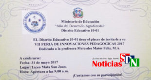 Por Jarlen Espinosa El Distrito Educativo 10-01 estará celebrando en el día de hoy la VII Feria de Innovaciones Pedagógicas 2017. Lugar Será a partir de las 9:00 am, en el Liceo Mata San Juan, en Villa Mella. Esta celebración estará dedicada a la profesora Mercedes Matos Feliz. Invita Nerys …