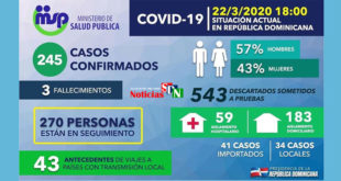 Por Jarlen Espinosa. Santo Domingo. – El Ministerio de Salud Pública ha lanzado su nuevo informe sobre casos confirmados de coronavirus (COVID-19) en la República Dominicana, en donde se muestra un ascenso de 202 ha 245 personas infectadas. Por el momento 270 personas están bajo investigación, 543 que se han …