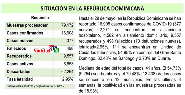 Sin embargo, en el día de hoy esas cifras han variado ascendiendo en la cantidad de contagiados por ejemplo, que ha aumentado de 16,531 a 16,908, los fallecidos de 488 a 498, los recuperados de 9,266 a 9,557, mientras que la tasa de mortalidad se mantiene en 2.95% según el Ministerio de Salud Pública.