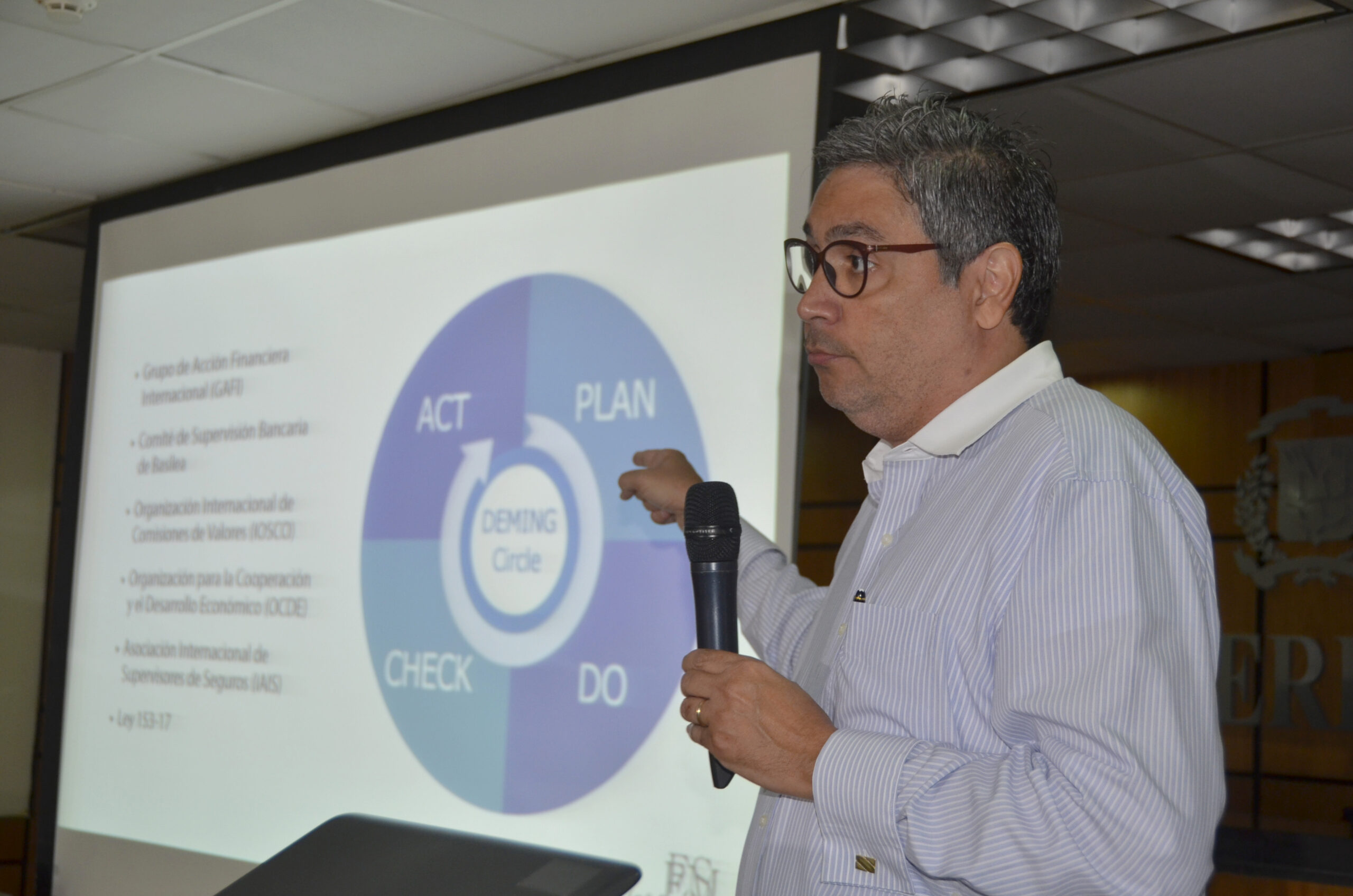 David Elías Melgen, abogado y Director de la Firma Estrella Sahdalá & Elías Melgen, sirvió como expositor y desarrolló los temas al personal/ dividido en dos grupos, en el primero realizado de 9:00 a 10:30 de la mañana donde participaron directores, subdirectores, encargados y el segundo de 11:00 de la mañana y concluyó a las 12:30 de la tarde para colaboradores, quienes conocieron la importancia del riesgo en las tomas de decisiones en las instituciones.