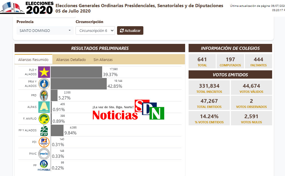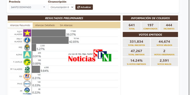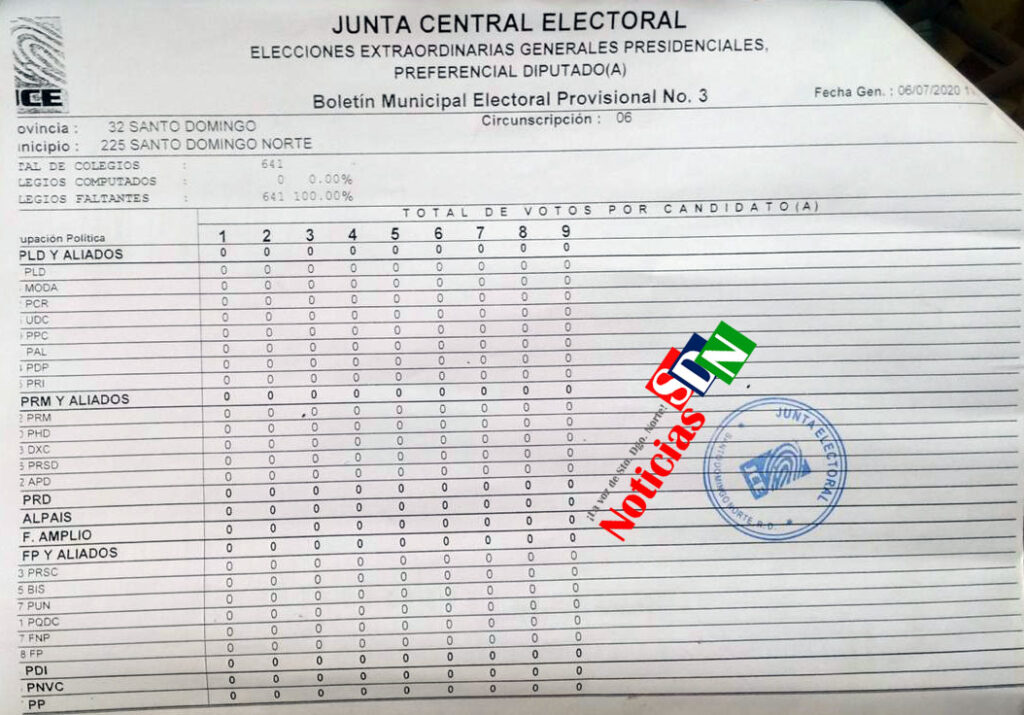 Santo Domingo Norte. – El boletín no. 3 por el cual va la Junta Central Electoral de este municipio, circunscripción no. 6, muestra que en el nivel de las diputaciones solo el 30. 73% ha sido computado.