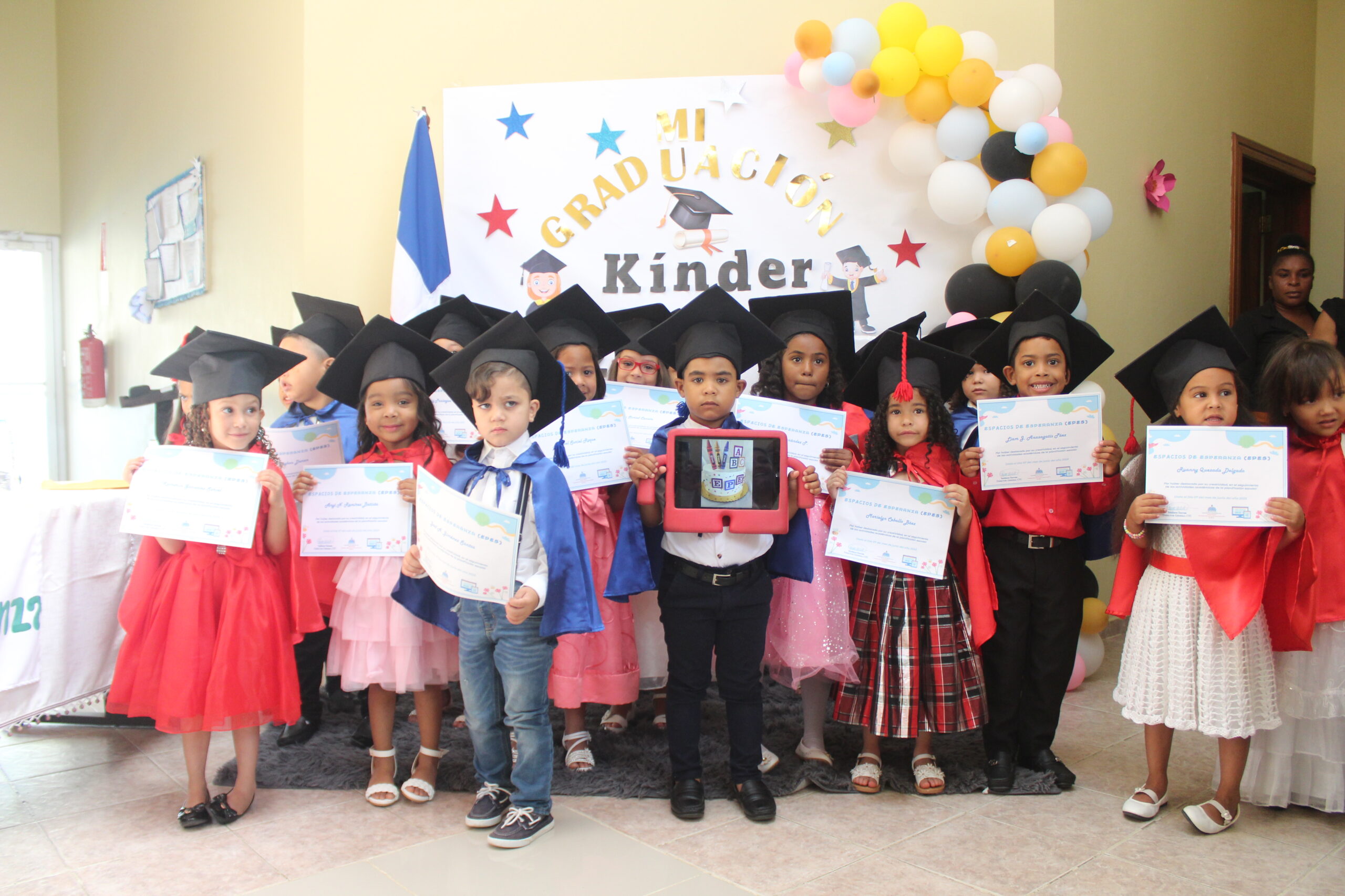 Santo Domingo.- Niños con togas y amplias sonrisas, niñas vestidas con trajes blancos que armonizan con sus caritas angelicales, varones con trajes formales, ellos, todos, agarrando orgullosos sus diplomas; y al frente, abuelos y padres, madres y emocionados, completan el panorama que se vivió en la última graduación de los Espacios de Esperanzas (EPEs), programa de los Centros Tecnológicos Comunitarios (CTC) que buscan contribuir a que la educación infantil sea más sólida y que los niños tengan un impulso inicial que resultará fundamental en su educación futura de estos.